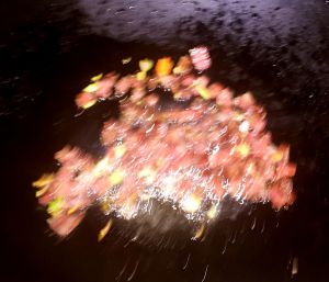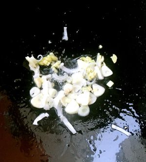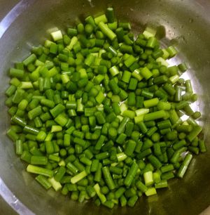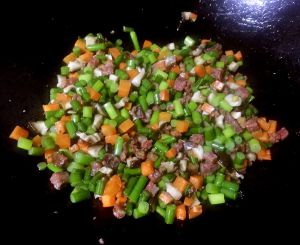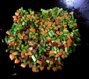 胡萝卜炒至变色放入蒜苔翻炒均匀