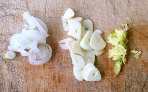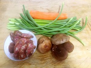 准备蒜苔、胡萝卜、香菇、香肠备用