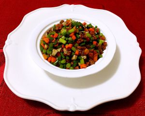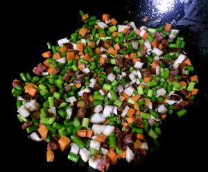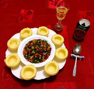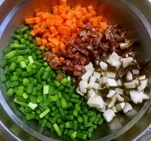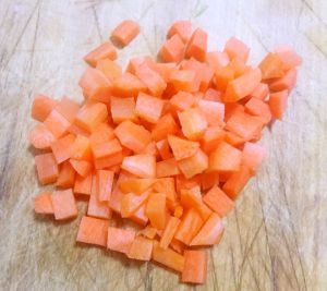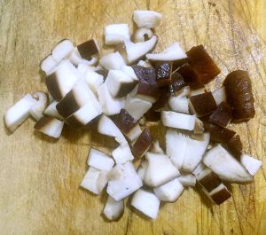 香菇用开水焯一下冷水过凉沥干水份切成小丁备用