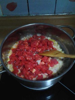 洋葱煸出香味放入切成丁的西红柿、大火翻炒