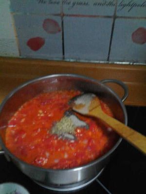 西红柿炒出水后,放入糖、黑胡椒粉、牛至叶、罗勒翻炒均匀