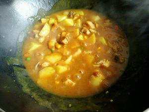 热锅上油将土豆块煎成金黄色,在下鸡腿一起翻炒,等鸡腿炒到金黄色在加入洋葱咖喱块一起翻炒,这时候加水,放入豌豆,玉米粒大火烧开转小火,等到土豆有点酥的时候大火收汁就可以了!