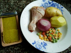 鸡腿提前解冻好,土豆削皮,蔬菜粒也准备好,我最爱的咖喱膏来了,只要放入半块咖喱膏就好了!