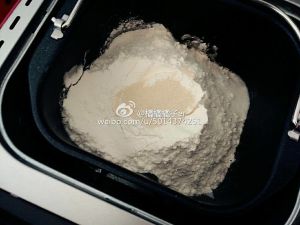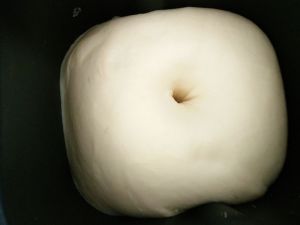 除黄油外所有主料放入面包机内揉至光滑(糖 盐对角放面粉中间戳小洞放酵母)