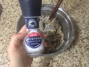撒入海盐。我用的这个海盐用盖子可以研磨碎,颗粒大小还不错。不会太细和普通的盐一样也不会太粗吃不粗来...