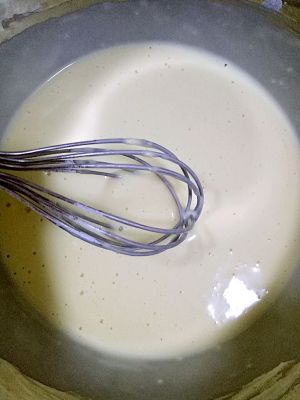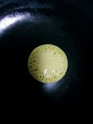 锅里烧热,不放油,用勺子舀一勺面糊倒在锅里,有小泡时翻面