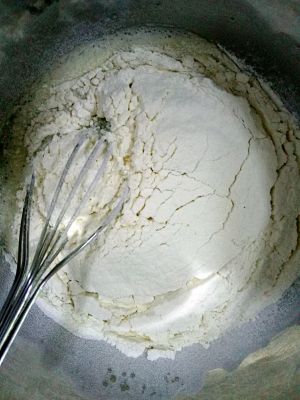 面粉和泡打粉混合均匀,筛入蛋液中