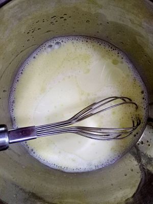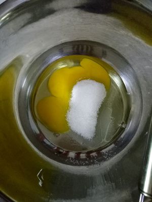 鸡蛋打入容器中,加入白砂糖,打到颜色有些发白