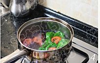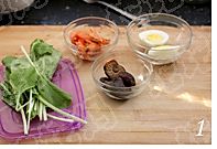 鸡蛋一个煮熟剥壳,用刀一剖两半备用,白菜叶去根洗净,香菇用温水泡发洗净,鲜虾过水焯熟;