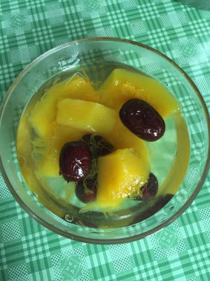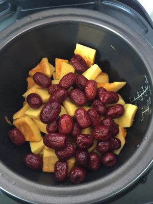 老南瓜切块,去皮,红枣洗净,放电饭锅加水【因为是甜汤,所以加水要多一点。个人喜欢加到最高线,夏天爱喝汤汤水水】