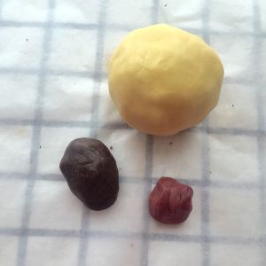 揉成面团,取其中两小份面团加入可可粉和红曲粉揉匀。