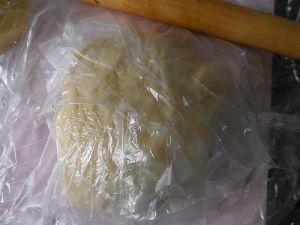 将发酵好的面团取出排气 ,然后盖上保鲜膜 静置15分钟左右