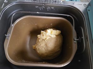 十分钟过去后,我们将软化的黄油 加入到面团中