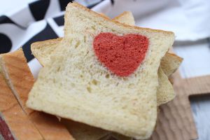 取一片事先做好的红曲戚风蛋糕,用心形的饼干模具在上面刻印出一个个心形的蛋糕