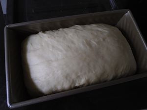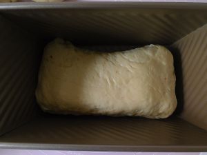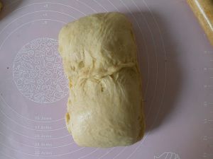 接着将包好蛋糕的面团捏合的部分朝下 ,放入学厨吐司模里