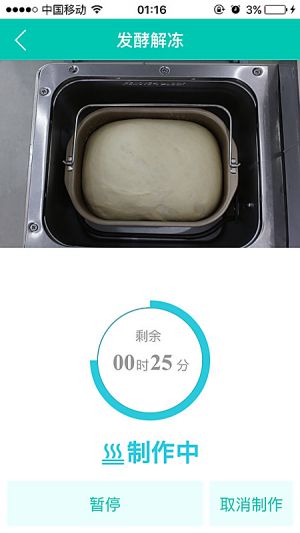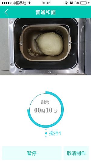 将面包机与手机连网,用手机来操控面包机!我们现在选择普通和面 ,时间选择10分钟即可。