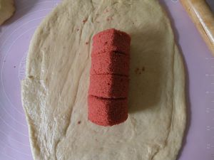 然后将静置好的面团擀成长长的片状,将心形蛋糕摆放在中间