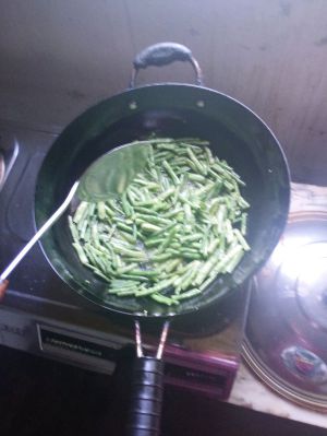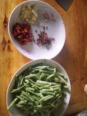 豆角洗好切段,大蒜,干辣椒,花椒准备好。