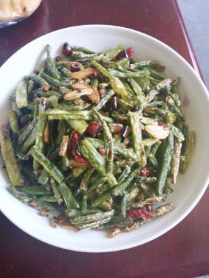 留少许油爆香蒜瓣、花椒、干辣椒,闻到香味后豆角下锅继续翻炒,一分钟后出锅,撒盐即可。