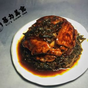 高潮来了,梅干菜铺底,一片片放肉,记得搁冰糖