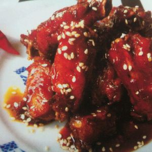 锅中放入少许油,下姜,葱炒香,掺入煮排骨的汤,加白糖,料酒,盐,糖色,八角,少许醋下排骨中小火收汁入味,待汤将干时加醋略收最后放芝麻油炒匀起锅,冷后装盘,撒上熟芝麻即可