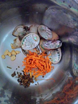 鲍鱼洗刷干净和其他材料冲洗一下一起放入锅中