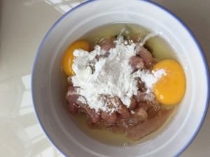 加适量的盐,五香粉,两个鸡蛋,四勺(常用的小勺子)面粉,一勺淀粉!