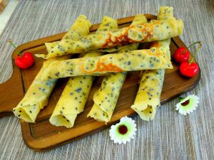 两面都煎至金黄色的时候,把蛋饼倒在面板上,趁热用一根筷子迅速卷起成蛋卷状卷到最后固定一会儿凉凉定型,剩下的面糊都按这个方法依次做好。