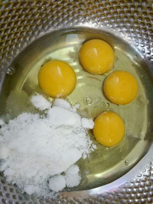 把鸡蛋和糖放在干净的盆中,用打蛋器轻轻搅拌均匀。