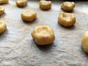 把面团分成小块,揉匀,用手指轻微压扁。表面刷蛋液。