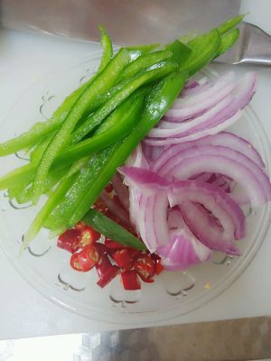将洋葱切丝,小米椒切圈,青柿子椒切丝,大蒜切片备用。