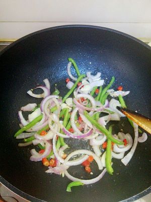 重起锅放少许植物油和黄油,依次放入蒜片,洋葱丝,小米椒,青椒丝,黑糊椒粉炒香。