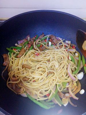 下入意面和牛里脊,放黑椒汁,老抽,盐,糖调味,继续翻炒。