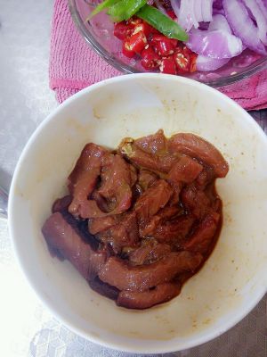 牛里脊切成小拇指宽的条,用红酒,盐,黑糊椒粉,淀粉搅均腌制10分钟左右。
