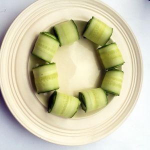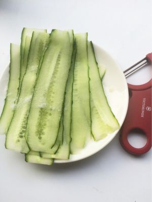 黄瓜洗干净去切头尾,用削皮刀削成宽片,用盐腌上2分钟,然后用凉开水冲洗干净。