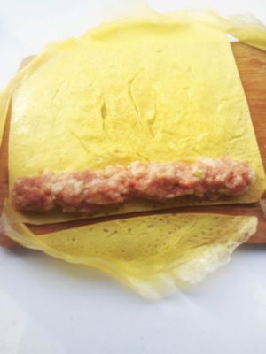 从锅内取出蛋皮,用刀切去四周不规则的地方,修成一个正方形,把肉馅放在蛋皮上。