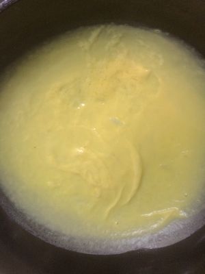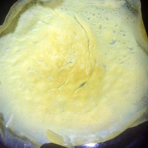 蛋皮凝固后翻个面再烙一会,过三十秒就可出锅,煎久了蛋皮会老。