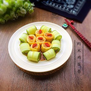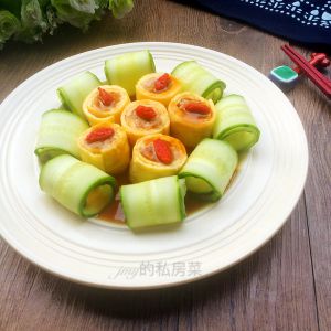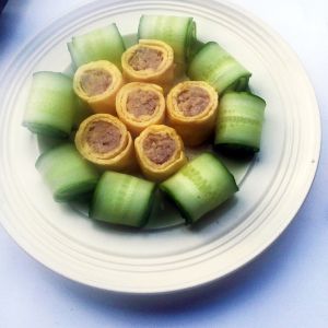 成品,黄瓜清香爽脆微咸,鸡蛋肉末卷非常的鲜嫩,绝好的搭配,这道菜也是老爸爱吃的,祝老爸身体健康,开心快乐!