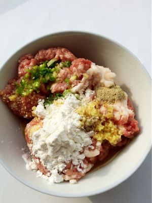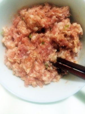 肉馅中加盐,白胡椒粉,料酒,生粉,葱末与姜末。