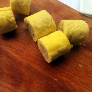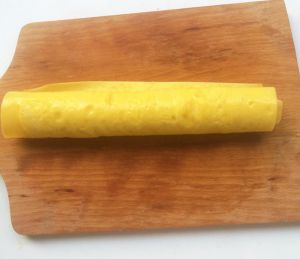 把鸡蛋卷从锡纸内取出,切成约五厘米长的段。