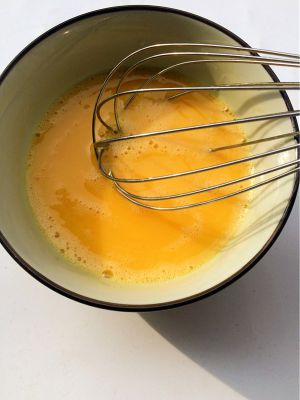 鸡蛋打散后加入少许盐和大约十克水搅打均匀,放小许水能前鸡蛋皮剪出来更嫩。