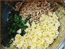 韭菜洗净切段,加入鸡蛋、虾仁、白胡椒粉、香油、盐、混合均匀即为馅料;