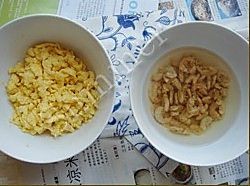 鸡蛋炒熟打散盛出放凉备用,干虾仁洗净用水浸泡一会儿,切成小粒备用;