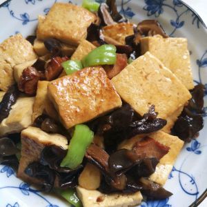 热油,放入腊肉,蒜片香菇木耳煸炒,放入生抽,蚝油,糖,豆腐,盐,加水适量,不要过分翻炒,以免弄碎豆腐,放青椒