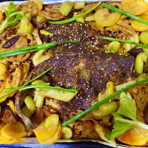 这时候烤鱼差不多好了,看看两面焦黄,然后把锅里炒好的配料连汤一起倒在鱼身上,摊开,尽量让鱼四周空隙多一点,放烤箱继续烤15分钟;