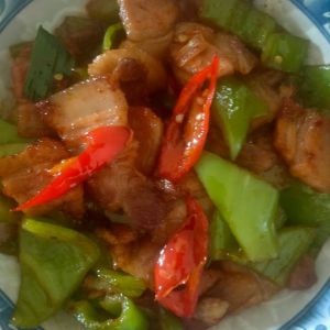 在加青椒炒熟,加适量盐,味精,糖,酱油炒均匀,
