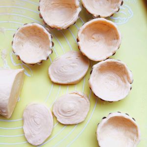 切成薄片,按入模具,两个大拇哥把底部按实,底部尽量按的薄一点,可以高于模具,因为我的目标是能装更多蛋液✌