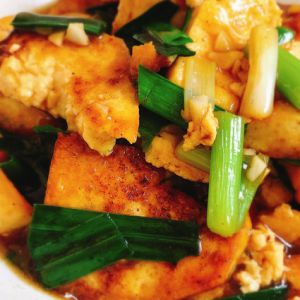 煎豆腐,两面至金黄色,放入蒜苗白,再撒上蒜末爆香,再放入蒜苗后倒入酱料大火收汁保留一点汁吃得更香哟,可以出锅!