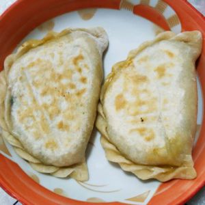 面粉用温水活成团,醒发30分钟,分成剂子,擀成和包包子大小的皮儿,电饼铛少量油,涂匀,像包大饺子一样,再捏上花纹