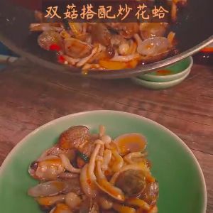倒入料酒,倒入双菇,翻炒15秒后,加一勺豆瓣酱,加一小勺盐,一勺糖,翻炒均匀